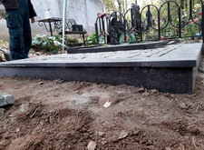Когда подготовительные работы на территории могилы были завершены, мы принялись за укладку брусчатки на пескобетон, сама плитка была уложена вровень с облицованным гранитными плитами цоколем. Параллельно с этим мы подготовили основание для последующей установки надгробья.